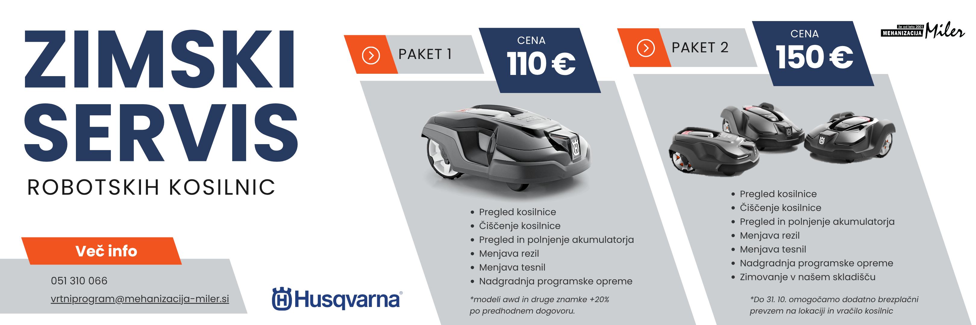 V našem podjetju vsem lastnikom robotskih kosilnic Husqvarna, ki so bile kupljene pri nas nudimo posebno ceno letnega servisa z zimovanjem. Različni paketi: