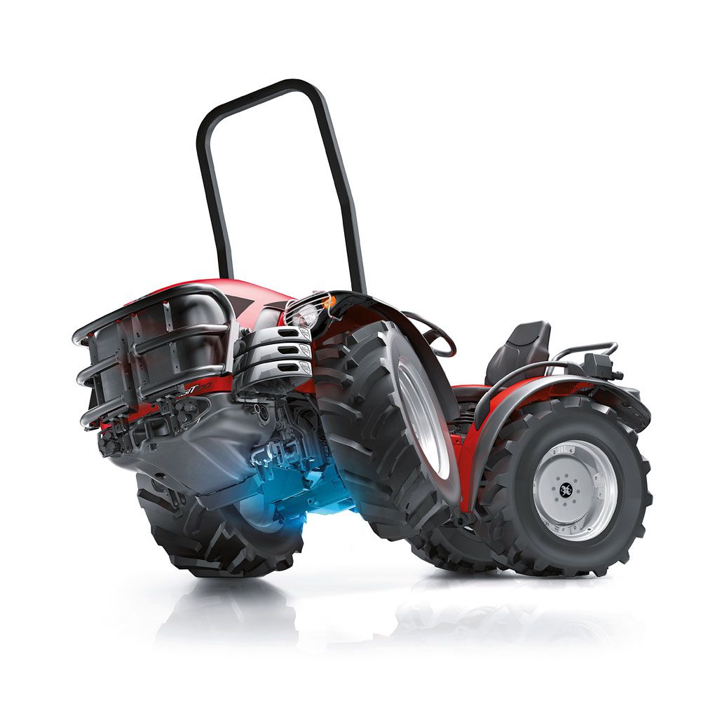 Artikulirano krmiljenje: Prednji in zadnji del se obračata ločeno, kar omogoča izjemno nizek obračalni radij – idealno za vrste v vinogradih in nasadih.